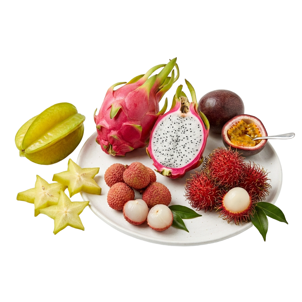 Dragon Fruit, Mangoes, Passion Fruit